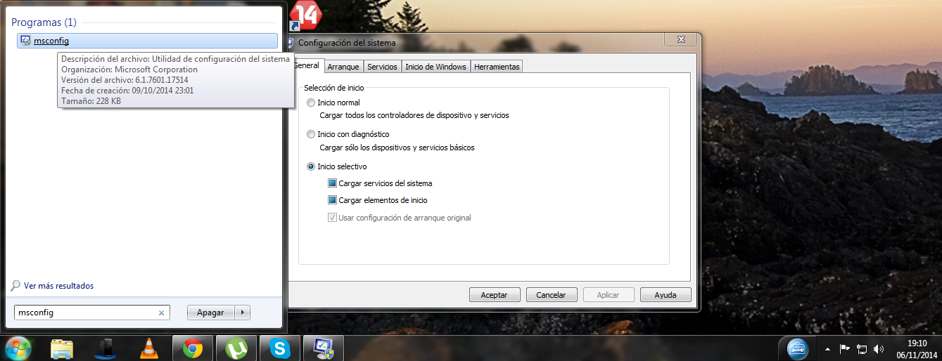 Acceder a configuración del sistema a través de Inicio>Buscar Programas y Archivos>msconfig