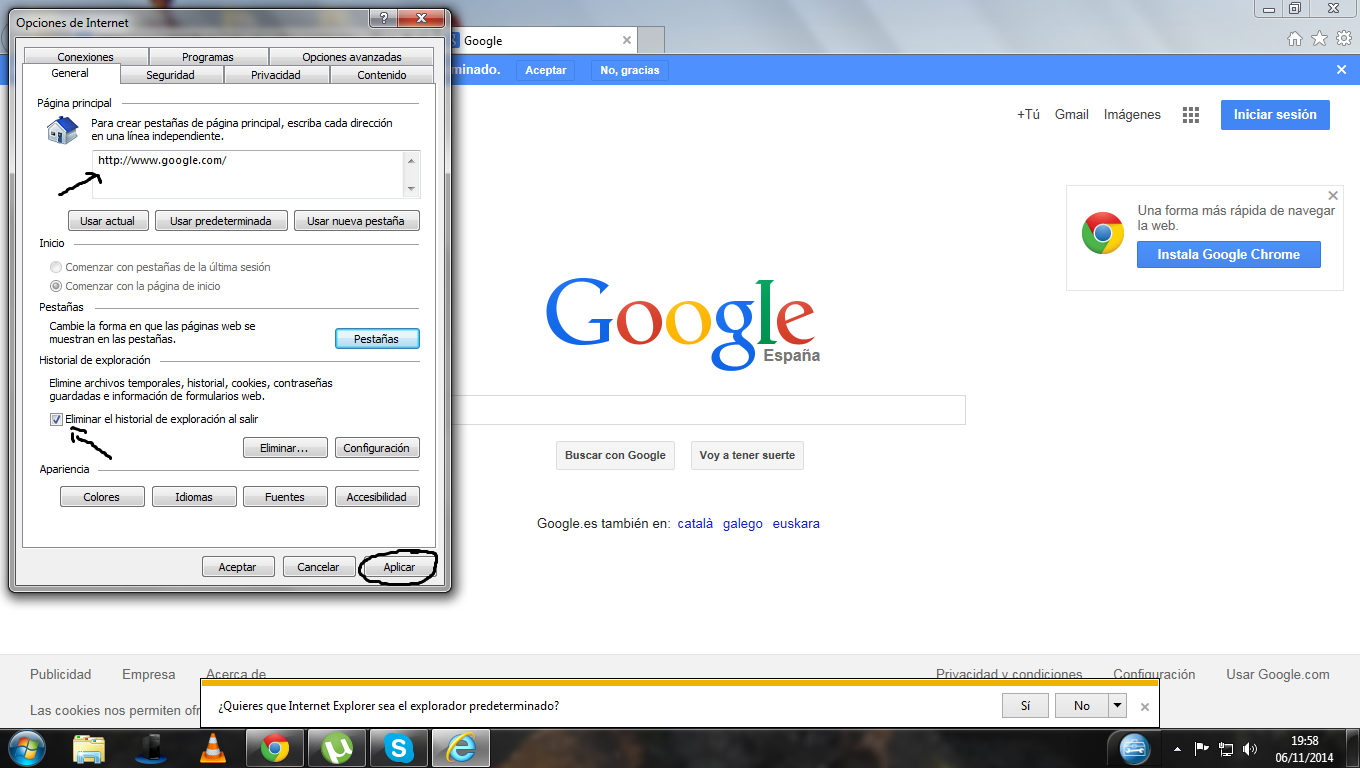 En la pestaña de opciones a internet podremos escoger la página de inicio y que eliminar el historial que nos interese: