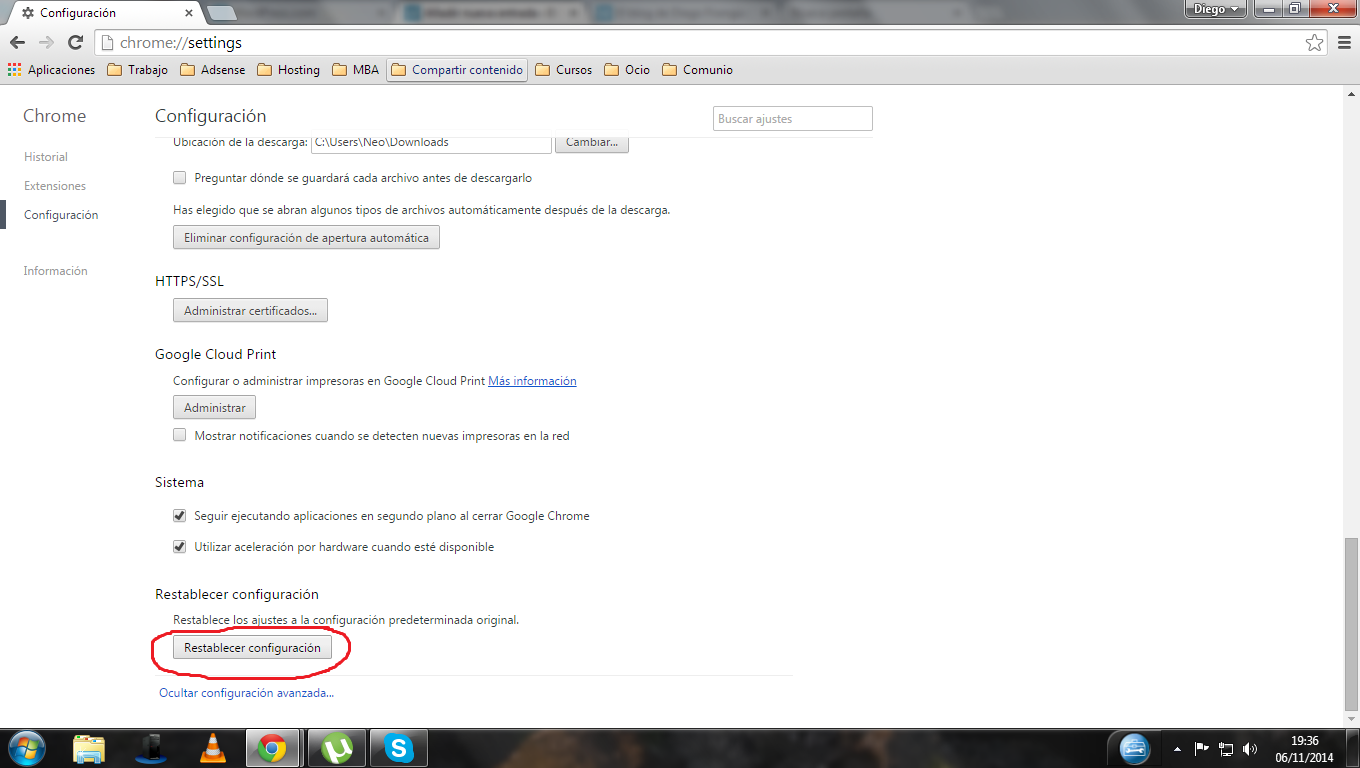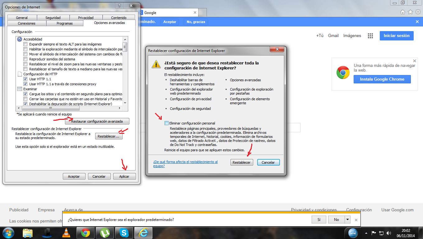 Al final de la configuración avanzada se podrá realizar la configuración predestinada y así resolver problemas de configuración con otras páginas de inicio y buscadores innecesarios como bing y otros.