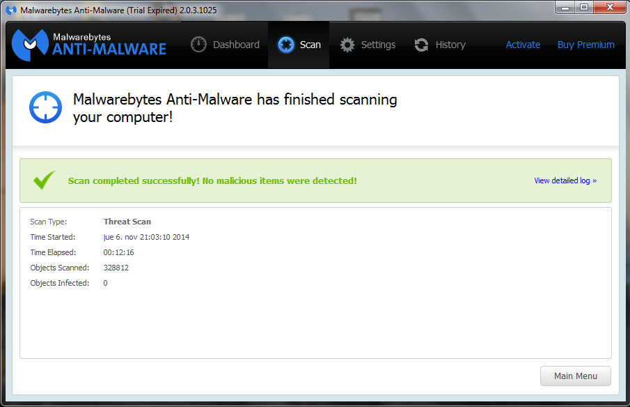 Para finalizar la limpieza de nuestro sistema realizaremos el análisis con Malwarebytes Anti-Malware, aunque probablemente no haga falta utilizar ambos aunque siempre puede que se haya quedado algo residual.