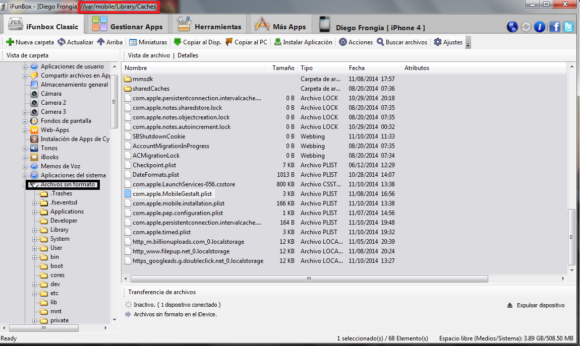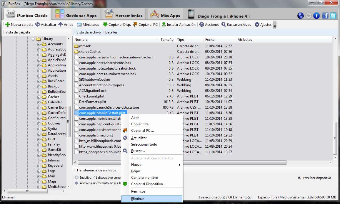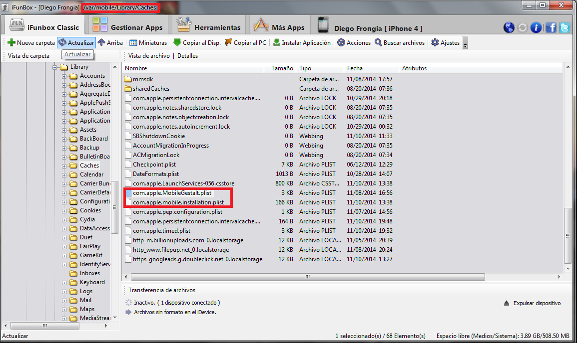Tras haber realizado este paso se tendrá q eliminar a través de iFunBox o iFile desde la ruta: //var/mobile/Lybrary/Caches los siguientes archivos: