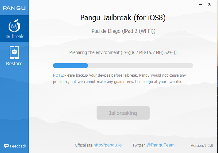 Tras haber realizado la descarga e instalación de la herramienta Pangu Jailbreak for iOS 8 y realizada la copia de seguridad se iniciará el proceso de Jailbreak.